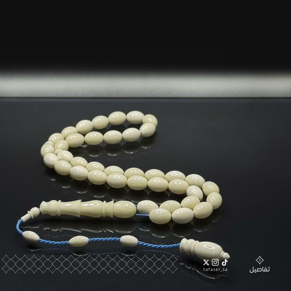 سبحة طبيعية من عظم الجمل بلون عاجي بعدد 39 خرزة متوسطة الحجم - بيضاوية - تتزين بطقم تمليكة أنيقة يدوية التفصال و الخراطة.• تقدم في [ تغليف أنيق مجهز بكرت إهداء فخم ].